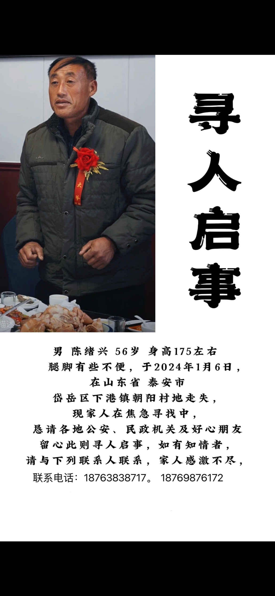 正文 失踪人员:陈绪兴 访客 V游客 /2024-01-22/2.48 K阅读/0评论 0122 姓名: 陈绪兴 性别: 男性 生日: 1965/01/22 籍贯: 山东省泰安市 失踪时间: 2024/01/06 失踪地点: 山东省泰安市岱岳区下港镇 失踪时身高: 175 在线联系: 微信号:shandong-1218 详情 腿脚有些不便,头发白,身高175左右,于1.26号出走至今未归, 寻人启事资料、照片等均由用户提供,如侵犯任何第三人肖像权、隐私权或其他合法权益,请联系本站删除!