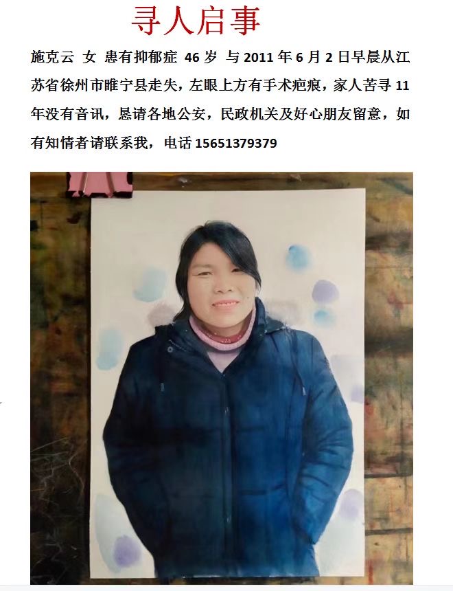 正文 失踪人员:施克云 访客 V游客 /2024-08-06/5.03 K阅读/0评论 0806 姓名: 施克云 性别: 女性 生日: 1966/07/03 籍贯: 江苏省 失踪时间: 2011/06/02 失踪地点: 江苏省徐州市睢宁县沙集镇蔡吴村 失踪时身高: 158 在线联系: 微信号:shandong-1218 详情 我的妈妈在2011年6月2日从家走失,左眼上方有手术伤疤 寻人启事资料、照片等均由用户提供,如侵犯任何第三人肖像权、隐私权或其他合法权益,请联系本站删除!